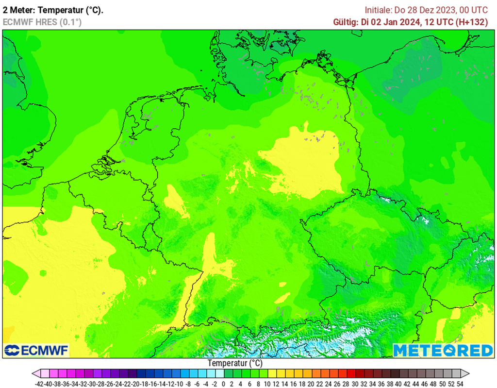 Ein weiterer Faktor, der die Hochwassersituation betrifft: Die Temperaturen bleiben weiterhin mild. Mit einer Schneefallgrenze von 1500 m, im Warmluftsektor sogar bis zu 2000 m, fällt der Niederschlag in allen deutschen Mittelgebirgen als Regen. Nur in den alpinen Regionen bleibt der Niederschlag in Form von Schnee liegen - der Rest bahnt sich seinen Weg in die ohnehin schon überfüllten Flüsse.