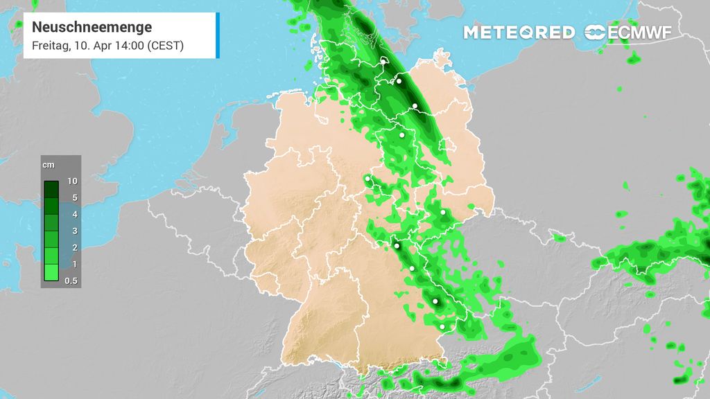 Am Freitag allerdings bildet sich ein Tief direkt über Norddeutschland. Das verursacht folglich eine Wetterunbeständigkeit die die Niederschläge verantwortet, welche das Europäische Wettermodell als Schnee klassifiziert.