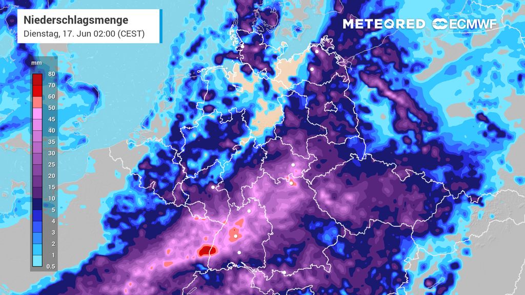 In den späten Abendstunden und über Nacht nimmt die Gewittertätigkeit in der Westhälfte weiter zu. Besonders betroffen sind Rheinland-Pfalz, Nordrhein-Westfalen und Teile Hessens. Dort können sich die Gewitter auch zu größeren Komplexen zusammenschließen, was die Gefahr von Unwettern nochmals erhöht. Besonders der Starkregen steht dabei im Fokus – mit Mengen über 35 Litern pro Quadratmeter in kürzester Zeit oder rund 60 Litern in wenigen Stunden ist lokal mit Überschwemmungen zu rechnen. Auch schwere Sturmböen bis 95 km/h und Hagel sind zunächst noch möglich, bevor die Gewitter gegen Morgen allmählich an Intensität verlieren.