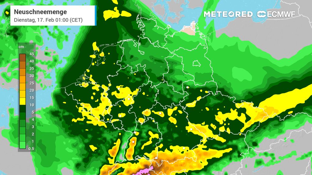 In der Nacht zum Montag verlagert sich das Schneefallgebiet weiter ost- und nordostwärts. Dabei schneit es verbreitet und teils intensiv. Häufig kommen 1 bis 5 Zentimeter Neuschnee zusammen – auch in tiefen Lagen, lokal sogar bis hinunter an den Rhein. In den Mittelgebirgen und an den Alpen werden 5 bis 10 Zentimeter erwartet. In exponierten Staulagen sind sogar um 15 Zentimeter innerhalb von nur sechs Stunden möglich. Besonders in höheren Regionen sorgt kräftiger Wind für zusätzliche Probleme: Es drohen Schneeverwehungen und stark eingeschränkte Sicht.