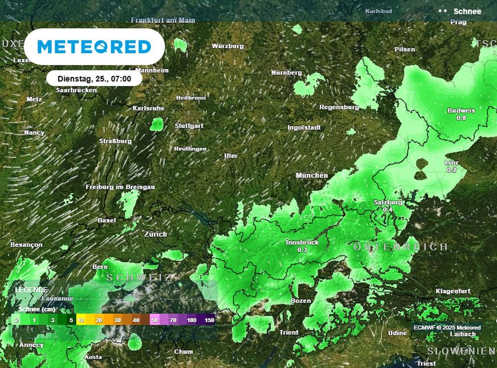 Der Schwerpunkt der Niederschläge liegt nach aktuellem Stand vom Bayerischen Wald bis in die Alpen. Bis Donnerstagmorgen rechnet man dort verbreitet mit 10 bis 20 cm Neuschnee. In den klassischen Staulagen der Alpen, vor allem oberhalb von 1000 m, sind sogar bis zu 30 cm möglich. Unterhalb davon mischt sich zwar zeitweise Regen dazu, doch bereits ab dem späten Dienstagabend sinkt die Schneefallgrenze weiter, sodass immer häufiger Schnee fällt.