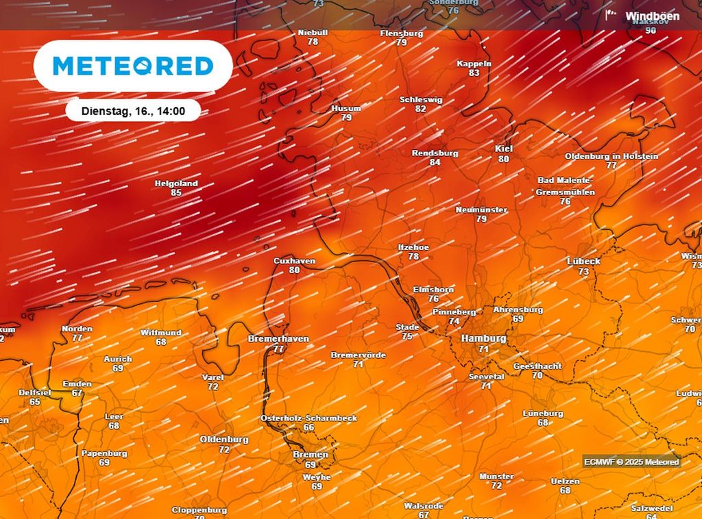 Die Wetterdienste warnen eindringlich: Am Montag und Dienstag drohen verbreitet Sturmböen. Im Westen und Nordwesten bis in tiefe Lagen erreichen die Böen 70 bis 85 km/h, in den Mittelgebirgen 85 bis 95 km/h. An der Nordsee und auf exponierten Gipfeln sind 95 bis 105 km/h möglich – dort dauert die Gefahr auch in der Nacht zum Dienstag an. Zusätzlich muss in Küstennähe mit kräftigen Gewittern gerechnet werden, die ihrerseits nochmals extreme Böen im Gepäck haben können. Das bedeutet: Gefahr durch herabfallende Äste, Schäden an Gebäuden und schwierige Verkehrsbedingungen.