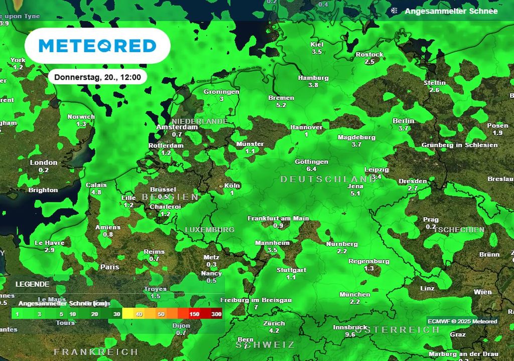 Für Bremen, Hamburg, Teile von Schleswig-Holstein und Nordniedersachsen berechnet das ECMWF in der zweiten Nachthälfte ein kompaktes Niederschlagsband, das sich verstärkt mit kälterer Luft mischt. Dadurch wird die Wahrscheinlichkeit für nassen Schnee bis in tiefe Lagen größer. Besonders die Regionen mit offener Landschaft und wenig Wärmeabgabe könnten am frühen Mittwochmorgen weiß werden. Auch wenn Straßen und Gehwege noch warm sein könnten, reicht laut Modell ein intensiver Schauer aus, um zumindest zeitweise Schneematsch und Glätte zu erzeugen.