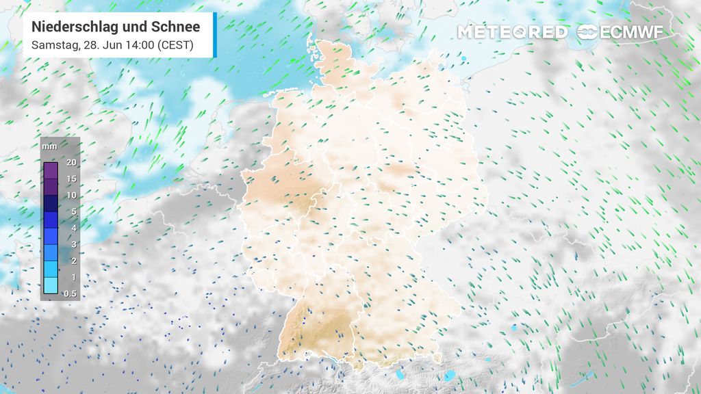 Parallel dazu baut sich ein zweiter Schwerpunkt heftiger Gewitter im Süden Deutschlands auf. Ab dem frühen Nachmittag entstehen vor allem im Bereich des Allgäus und angrenzenden Alpenvorlands zunehmend kräftige Gewitter, die sich ostwärts ausbreiten. Auch hier sind Sturmböen mit Geschwindigkeiten zwischen 70 und 100 km/h möglich – vereinzelt sogar mehr.