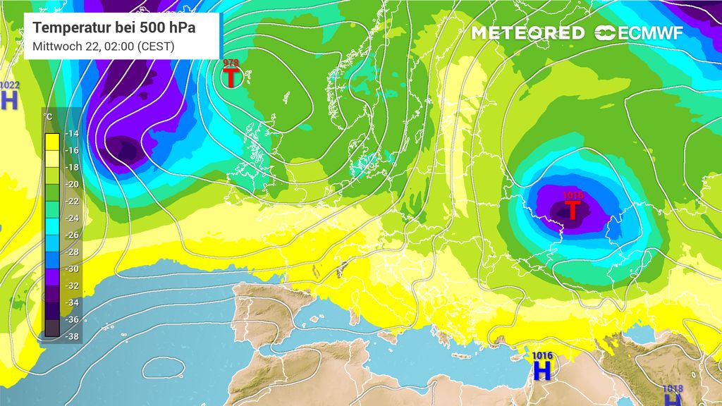 Auf dem Nordatlantik bildet sich ein neues Tiefdruckgebiet. An seiner Vorderseite wird milde Atlantikluft weit nach Osten transportiert.