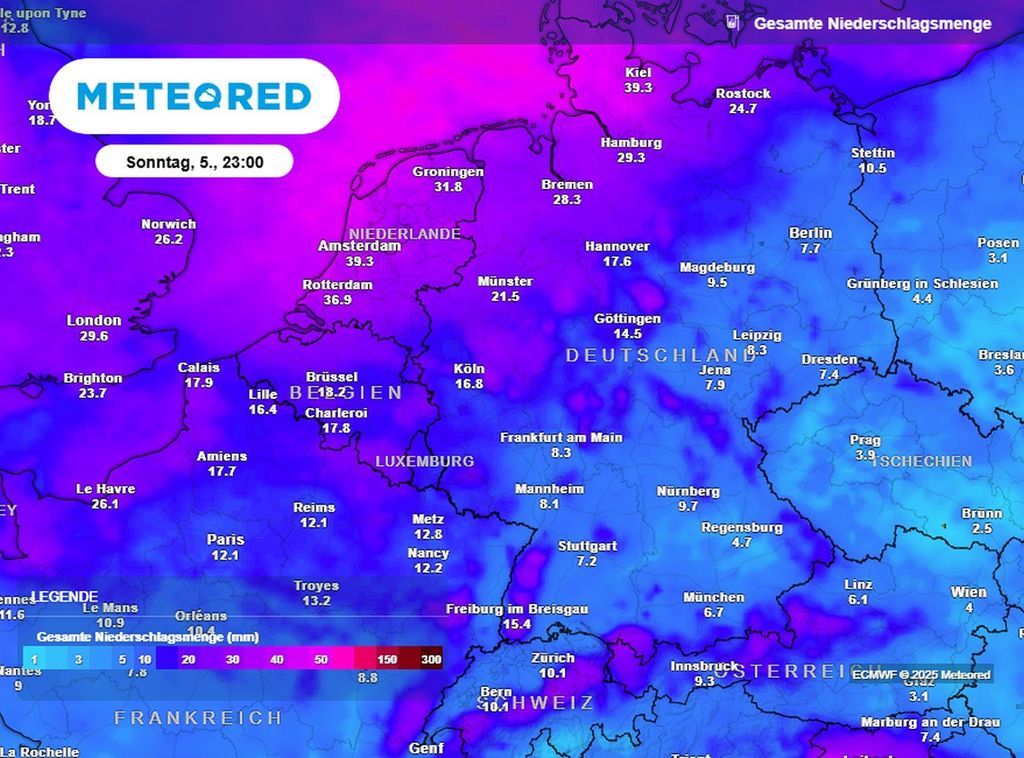 Die Temperaturen liegen bei 14 bis 19 Grad, am südlichen Oberrhein kann es bis 21 Grad warm werden. Im Südosten und am Alpenrand bleibt es dagegen bis zum Abend meist trocken – ein kleiner Lichtblick. In der Nacht zum Sonntag ziehen Schauer nach, örtlich auch Gewitter, besonders an der Küste. Im Süden regnet es weiter. Die Temperaturen sinken auf 10 bis 3 Grad, an den Küsten bleiben Böen bis 85 km/h bestehen.