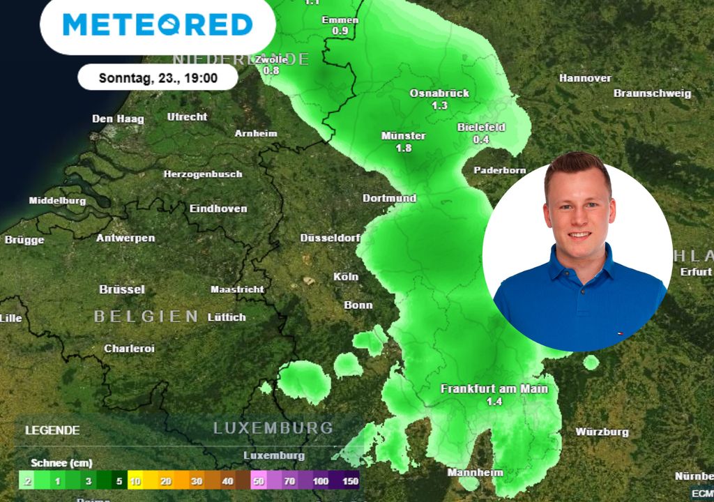 Mit Annäherung des Tiefs beginnt am Nachmittag aus dem Westen heraus plötzlich Schneefall, der sich rasch über Nordrhein-Westfalen, Niedersachsen, Rheinland-Pfalz und Teile Baden-Württembergs ausbreitet.