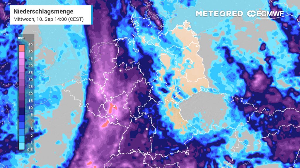 Eine schleifende Front sorgt im Westen für Dauerregen. In der Nacht drohen bis zu 80 Liter, gefährliche Überschwemmungen und massive Auswirkungen.