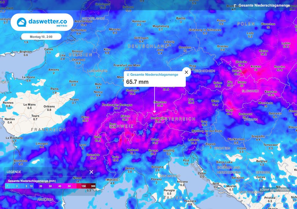 Schwerpunkt der Niederschläge dürfte nach aktuellen Berechnungen eher der südliche Teil Bayerns sein. Innerhalb von 24 Stunden sind dann 10-20 l/m² Niederschlag locker drin, in der Spitze auch 30 l/m² oder mehr. Gerade am Alpenrand könnten auch Mengen von 40-50 l/m² innert 24 Stunden fallen.