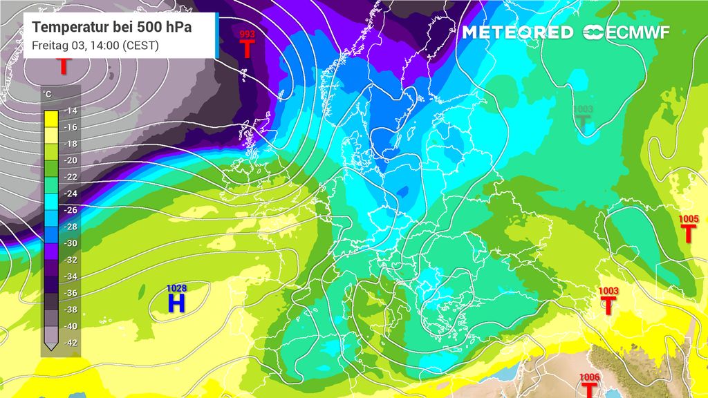 Zum Wochenende hin stellt sich die Großwetterlage um. Die Strömung dreht auf Südwest – ein klassisches Signal für den Zustrom milder Luft aus dem Atlantikraum.