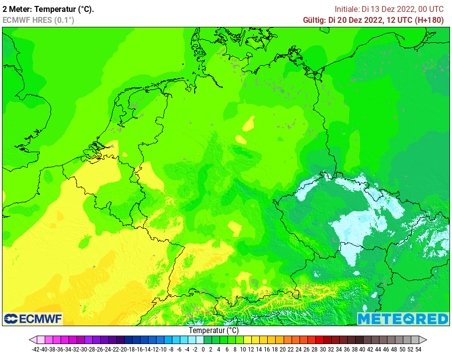 Pünktlich zur Weihnachtswoche schwenkt die Witterung jedoch um. Der Polarwirbel wird weiter nach Norden zurückgedrängt, stattdessen machen atlantische Tiefdruckgebiete die Musik. Dabei werden milde und feuchte Luftmassen nach Deutschland gelenkt, außerdem wird es windig. Niederschläge sind auch hier wahrscheinlich. Bei Temperaturen von 6 bis 10 °C, wie unten beispielhaft dargestellt für Dienstag, 20. Dezember, fallen diese jedoch überwiegend als Regen. In Baden-Württemberg sind sogar Temperaturen von mehr als 10 °C möglich. Schnee gibt es dann wohl nur in den Mittelgebirgen und den Alpen oberhalb von ca. 800 m.