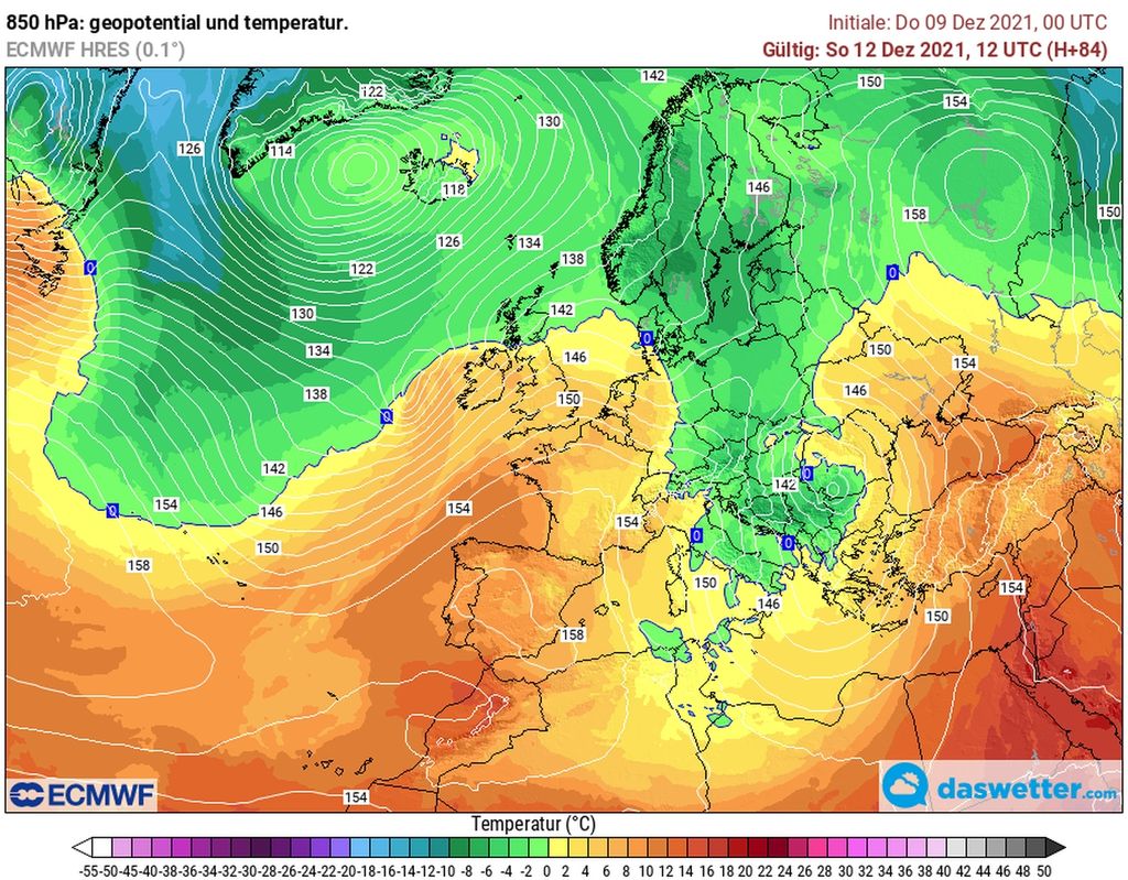 Eine ausgedehnte Tiefdruckzone erstreckt sich von Island über die Nordsee und Teile Deutschlands bis hinunter zum Mittelmeer. Sie hält die kühle Luft zunächst noch bei uns fest. Ein Hoch über dem Atlantik stemmt sich aber mit Macht dagegen und drückt ab Sonntag mildere Luft zu uns.