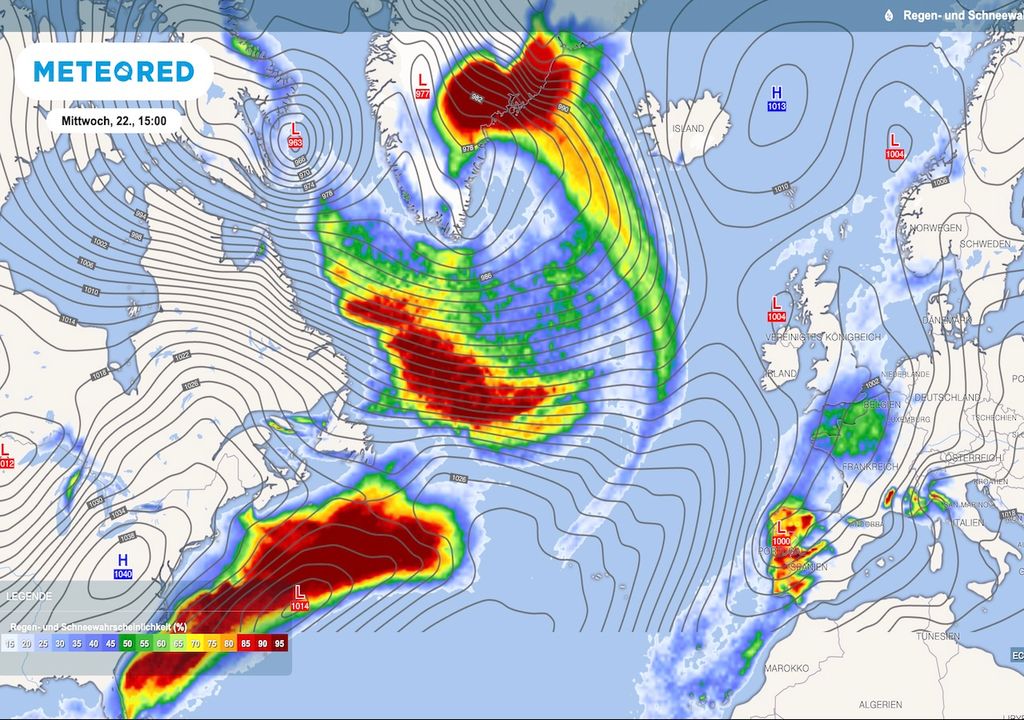 Im Nordwesten des Atlantiks dient unter anderem diese Kaltluft als Initialzündung für eine rapide Zyklogenese, bei der sich ein kleines Tief in kürzester Zeit zu einem Orkantief entwickelt, das den Nordatlantik durchquert. Folglich wird der Tiefdruckeinfluss vom Westen her auf den Europäischen Kontinent größer.
